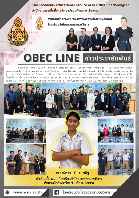 เมื่อวันที่ 30 มกราคม 2569 นางสาววัชนี ชูสุวรรณ ผู้อำนวยการโรงเรียนวัดโสธรวรารามวรวิหาร รองผู้อำนวยการ และคุณครู กลุ่มสาระการเรียนรู้สุขศึกษาและพลศึกษา นำนักกีฬากรีฑา เข้าร่วมพิธีมอบโอวาทแก่นักกีฬาและเจ้าหน้าที่ทีม โดยมีนางสาวฉัตรประอร นิยม ผู้ว่าราชการจังหวัดฉะเชิงเทรา เป็นประธานในพิธี นางปวีณวรรณ นิลกำแหง ท่องเที่ยวและกีฬาจังหวัดฉะเชิงเทรา พร้อมด้วยคณะนักกีฬา เจ้าหน้าที่ และผู้บริหารสถานศึกษา ณ ห้องประชุมสุนทรพิพิธ ชั้น 3 ศาลากลางจังหวัดฉะเชิงเทรา ก่อนเข้าร่วมการแข่งขันกีฬานักเรียน นักศึกษาแห่งชาติ ครั้งที่ 45 “ฅนบุรีรัมย์เกมส์” ประจำปี 2569 ซึ่งจะจัดขึ้นระหว่างวันที่ 4 – 12 กุมภาพันธ์ 2569 ณ จังหวัดบุรีรัมย์