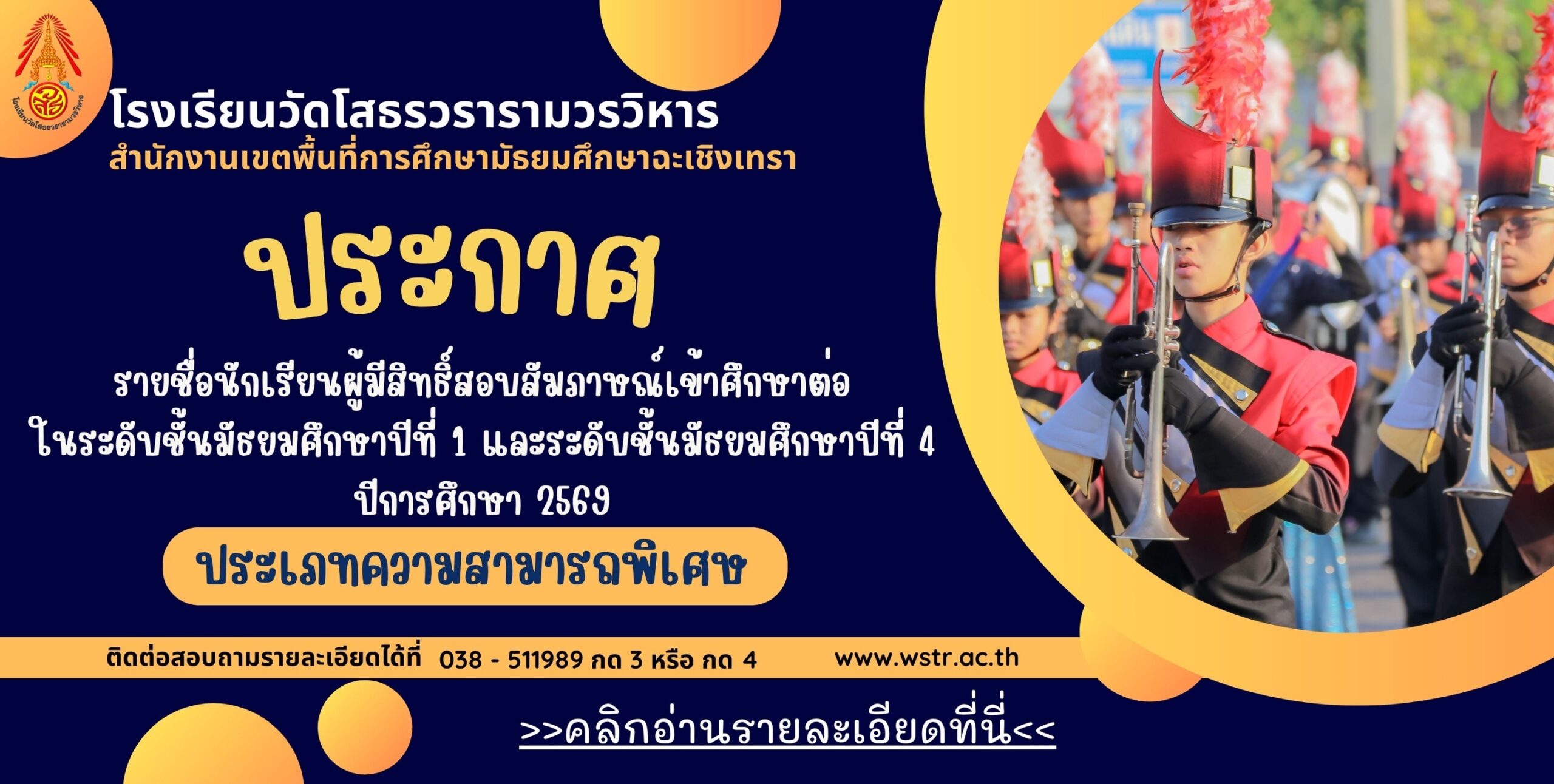 ประกาศ รายชื่อนักเรียนผู้มีสิทธิ์สอบสัมภาษณ์ ม.1 และ ม.4 ประเภทความสามารถพิเศษ ประจำปีการศึกษา 2569 ดาวน์โหลดเอกสารได้ที่นี่ >>ดาวน์โหลด<<