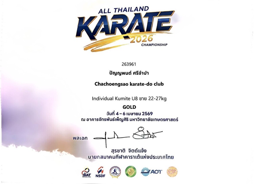 วันที่ 4 – 6 เมษายน 2569 นางสาววัชนี ชูสุวรรณ ผู้อำนวยการโรงเรียนวัดโสธรวรารามวรวิหาร แสดงความยินดีกับ ด.ช. ปัญญพนต์ ศรีจำปา นักเรียนชั้นประถมศึกษาปีที่ 1/1 เข้าร่วมการแข่งขันคาราเต้ ALL THAILAND KARATE CHAMPIONSHIP 2026 การแข่งขันกีฬาคาราเต้ชิงชนะเลิศแห่งประเทศไทย ครั้งที่ 57 ประจำปี 2569 ประเภทต่อสู้ เยาวชนชายรุ่นอายุ 6-7 ปี น้ำหนัก 22 – 27 kg ณ อาคารจักรพันธ์เพ็ญศิริ มหาวิทยาลัยเกษตรศาสตร์ ได้รับรางวัลเหรียญทอง